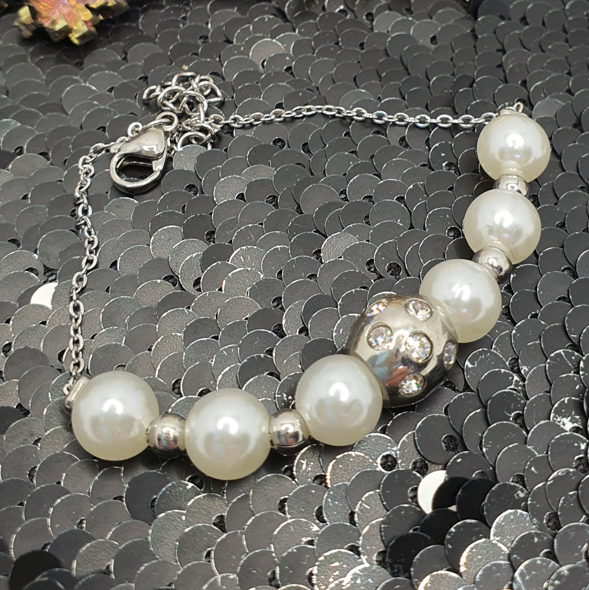 Náramok je zdobbený bielymi perličkami a guličkou vykladanou kamienkami. Priemer guličiek je O,8 cm, a guličky z ocele 1 cm. Dĺžka náramku je 20 cm, ale dĺžka sa da nastaviť. Náramok je vyrobený z chirurgickej ocele v striebornom prevedení.