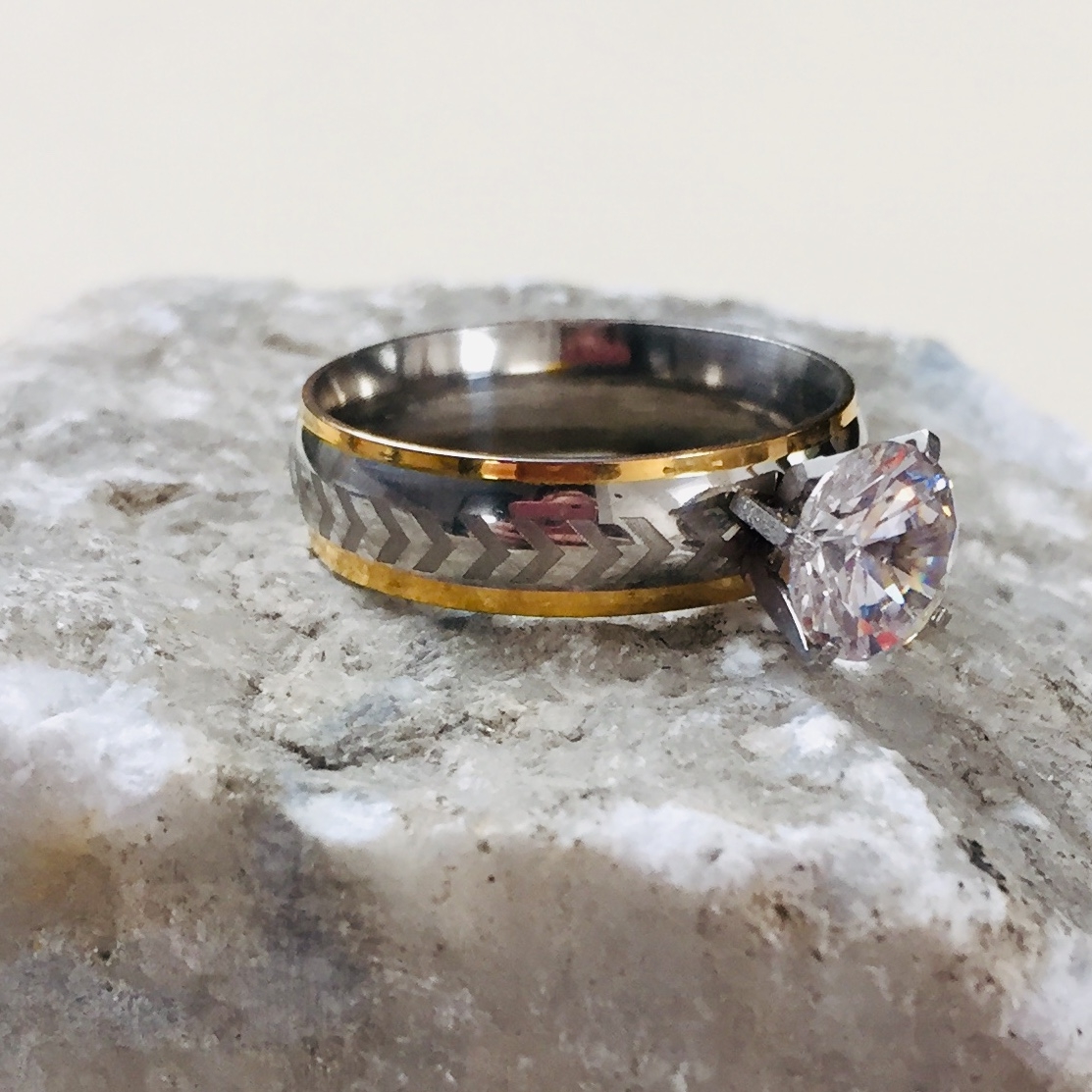 prsteň má šírku 0,4 cm a je zdobený kameňom. Prsteň je vyrobený z chirurgickej ocele v striebornom prevedení