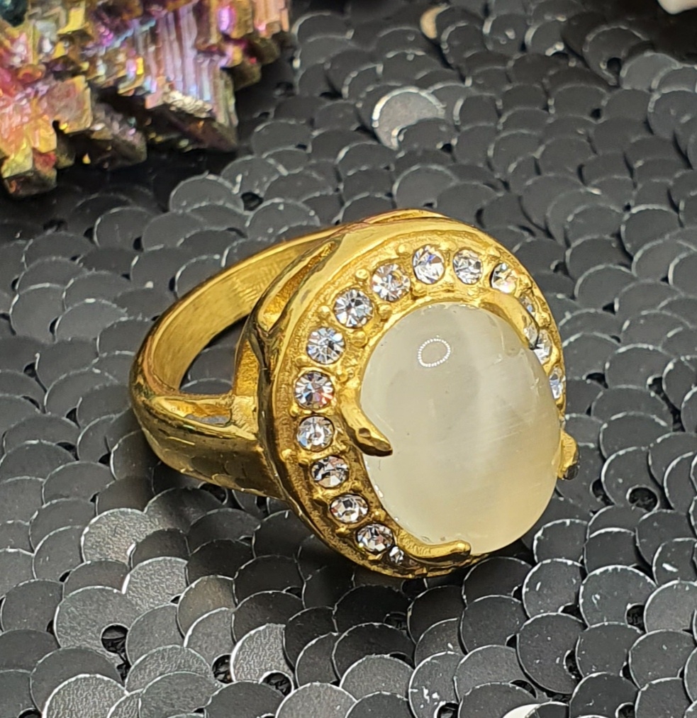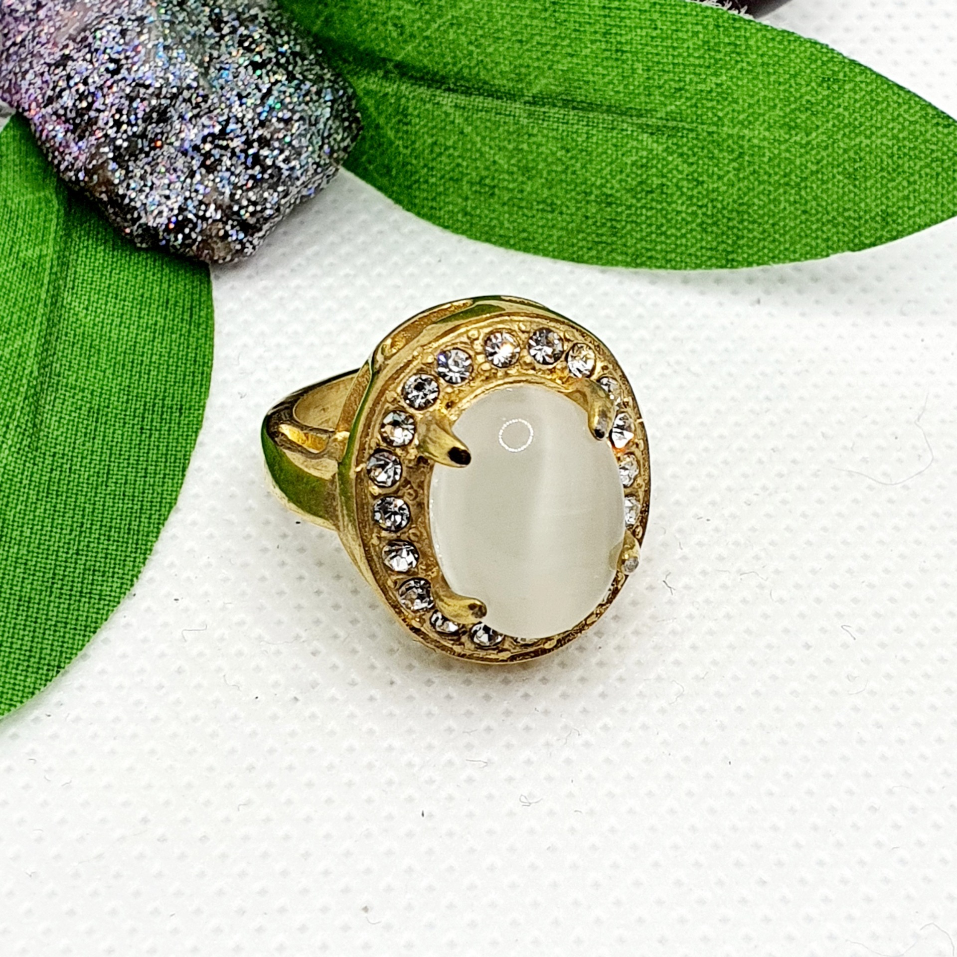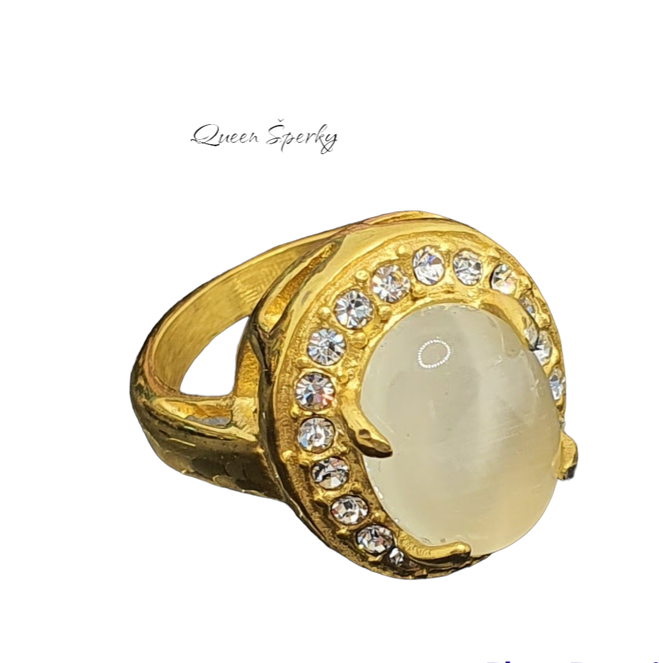 prsten má rozmery 1,5 x 2 cm a je zdobený perleťovým kameňom. Prsteň je vyrobený z chirurgickej ocele v zlatom prevedení.